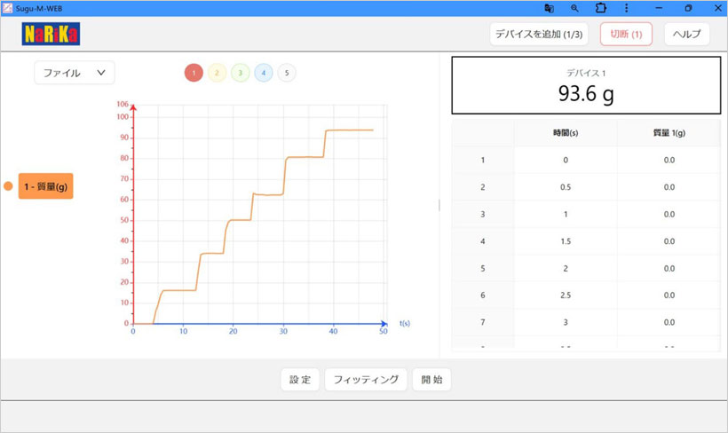 質量センサで取り込んだデータを元にグラフ描画やCSV形式として出力を行うアプリです。データはほぼリアルタイムでグラフに反映されますので、実験の様子とグラフの変化を同時に確認することができます。